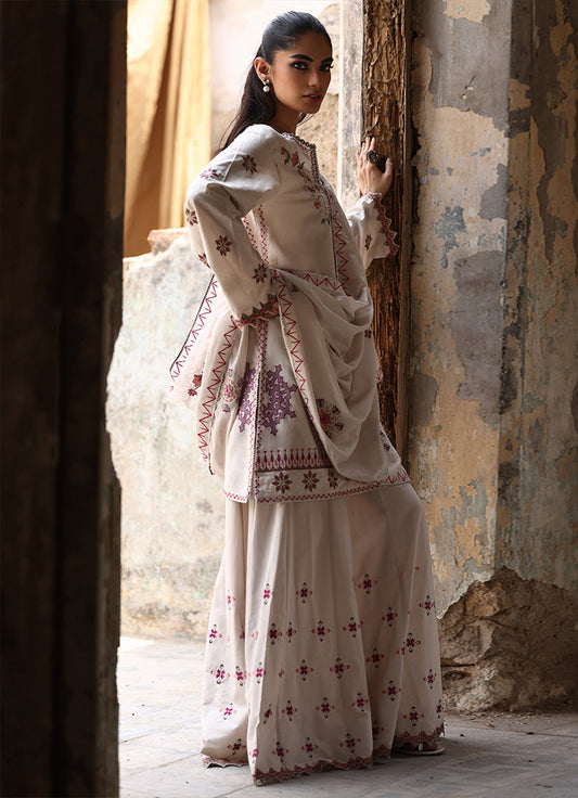 A luxury edit of ghararas in cotton satin & soft organza, adorned with exquisite embroidery and artisanal detailing.