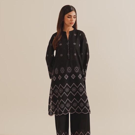 The Black Cotton Embroidered Co-ord Set from our Image Signature category features a round neckline with a slit & full-length bell sleeves paired with embroidered trousers.