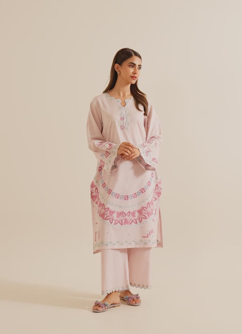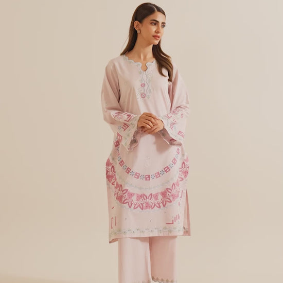 The Pink Cotton Embroidered Co-ord Set from our Image Signature category features a round neckline with a slit & full-length bell sleeves paired with embroidered trousers.