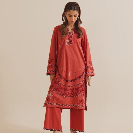 The Rust Cotton Embroidered Co-ord Set from our Image Signature category features a round neckline with a slit & full-length bell sleeves paired with embroidered trousers.