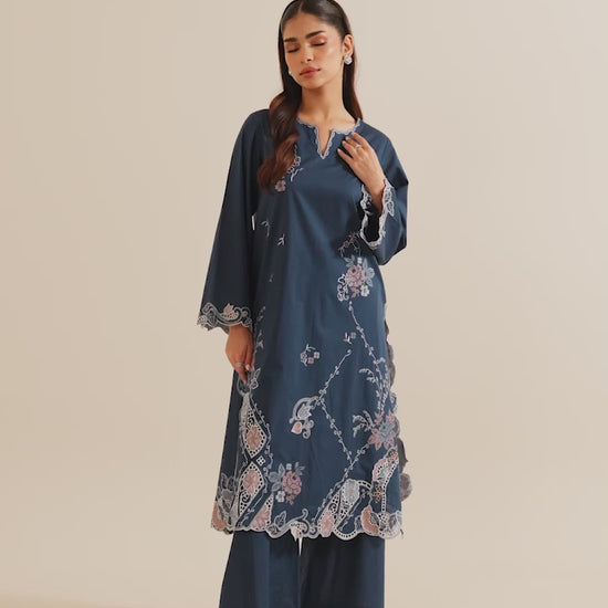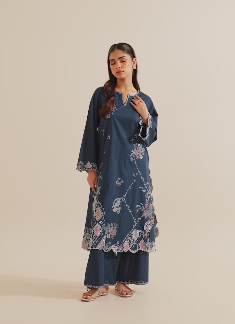 The Blue Cotton Embroidered Co-ord Set from our Image Signature category features a round neckline with a slit & full-length bell sleeves paired with embroidered trousers.