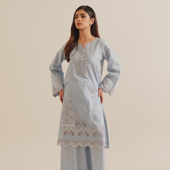 The Light Blue Cotton Embroidered Co-ord Set from our Image Signature category features a round neckline with a slit & full-length bell sleeves paired with embroidered trousers.