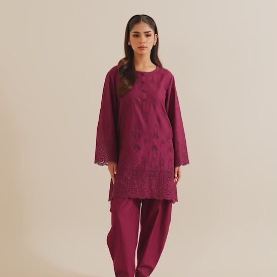 The Deep Wine Cotton Embroidered Co-ord Set from our Image Signature category features a round neckline & full-length bell sleeves paired with an embroidered shalwar.