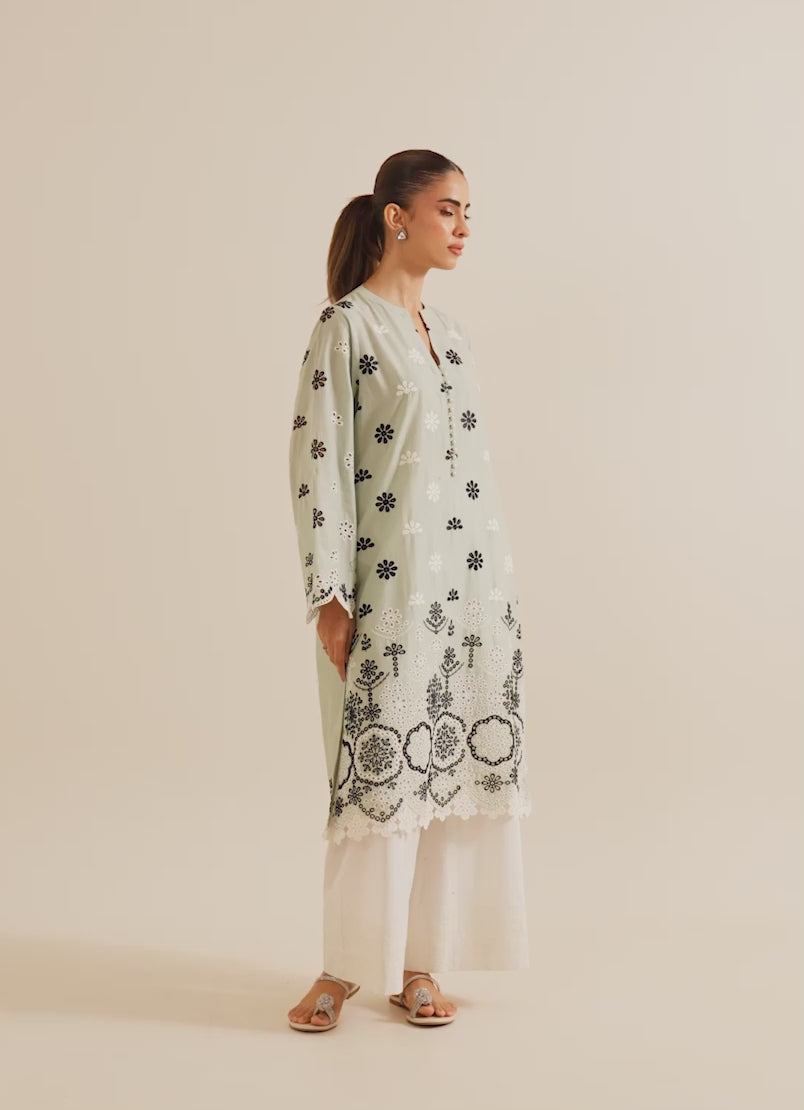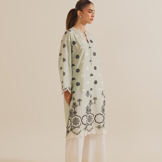 The Light Green Cotton Embroidered Kurta from our Image Signature category features band collar & full-length bell sleeves.