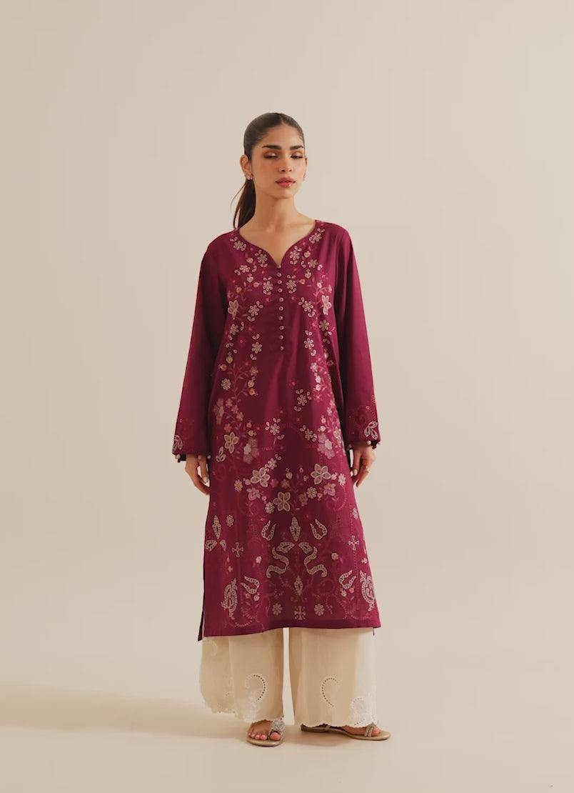 The Mauve Cotton Embroidered Kurta from our Image Signature category features V neckline & full-length bell sleeves.
