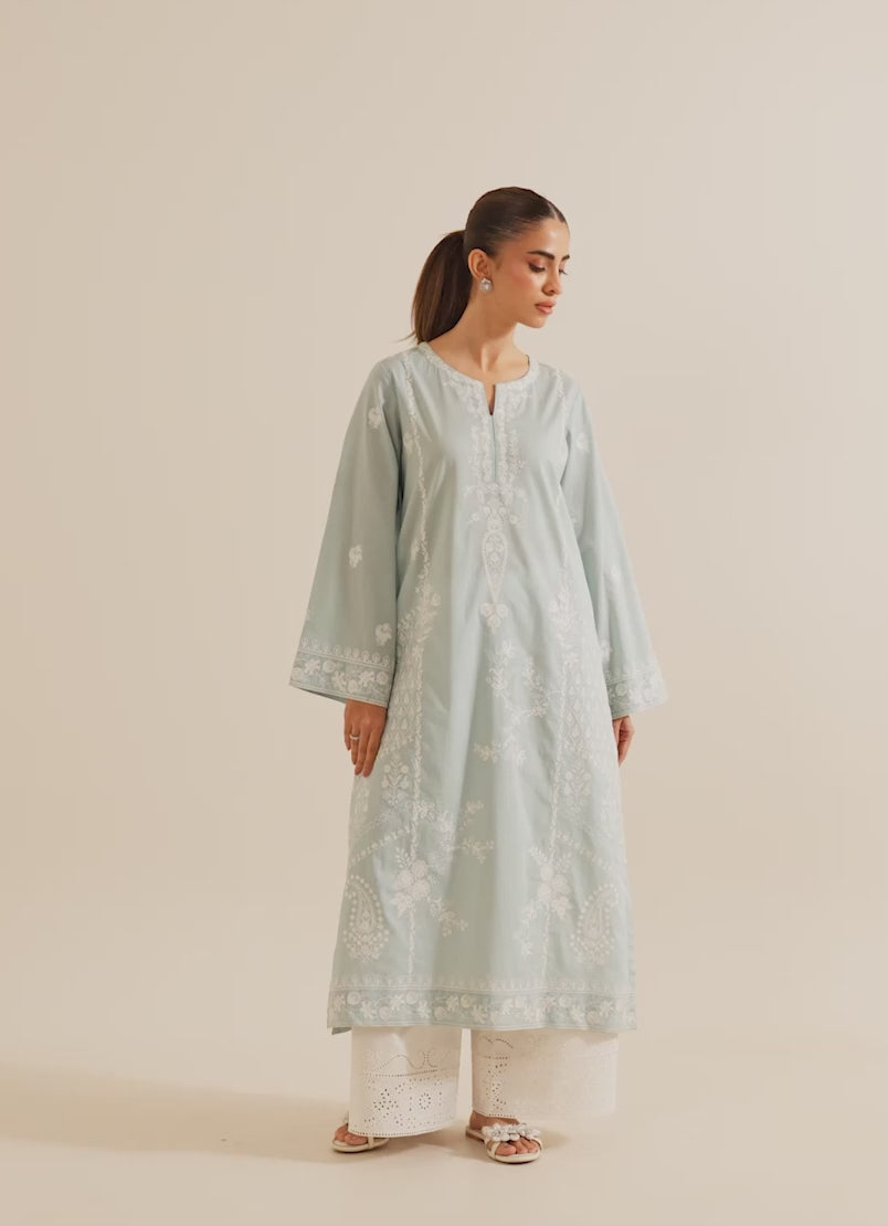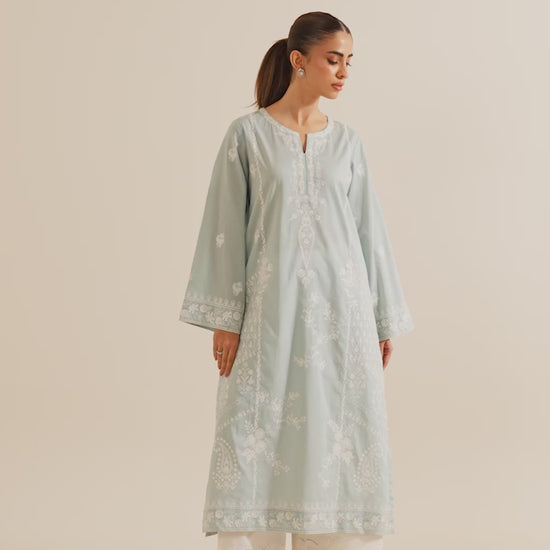 The Light Blue Cotton Embroidered Kurta from our Image Signature category features round neckline with a slit & full-length bell sleeves.